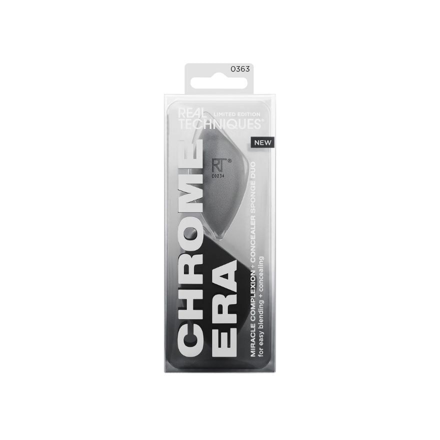 The Real Techniques Chrome Era Miracle Complexion + Concealer Sponge Duo includes two makeup sponges to easily blend and conceal for a seamless finish. The duo comes with the iconic best-selling Miracle Complexion Sponge and Miracle Concealer Sponge. The full-size MCS blends makeup all-over for a lightweight natural, dewy glow while the Concealer Sponge precisely conceals to brighten under eyes or cover blemishes. Both makeup blending sponges work best with liquid and cream formulas. They have RT’s unique 3-point application technique that gives a streak-free finish every time. First use the flat edge of the sponge to apply product, then the precision tip to conceal and perfect, and finally, blend it all out with the rounded side. Use the makeup sponges damp for extra dewiness. It’s time for your makeup to shine with the limited-edition Chrome Era Collection. Both Chrome Era makeup sponges are easy to clean using the Real Techniques Brush + Sponge Cleansing Gel. They’re also 100% cruelty-free, vegan, and designed with revolutionary latex-free foam technology.